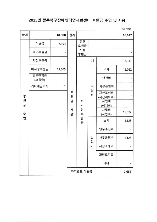 2025년 광주북구장애인직업재활센터 후원금 수입 및 사용내역 공고 페이지 정보 작성자 관리자 작성일26-03-04 17:01 조회211회 댓글0건 이전글 다음글 목록 본문 사회복지법인 및 사회복지시설 재무․회계규칙 제41조의 6의 규정에 의거하여 2025년 광주북구장애인직업재활센터 후원금 수입 및 사용 내역을 다음과 같이 공개합니다. 이전글 다음글 목록