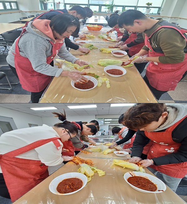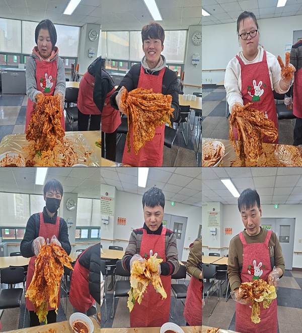 잘 절여진 배추 사이로 감칠맛 폭발하는 김칫소를 넣고 빨갛게 버무리면~