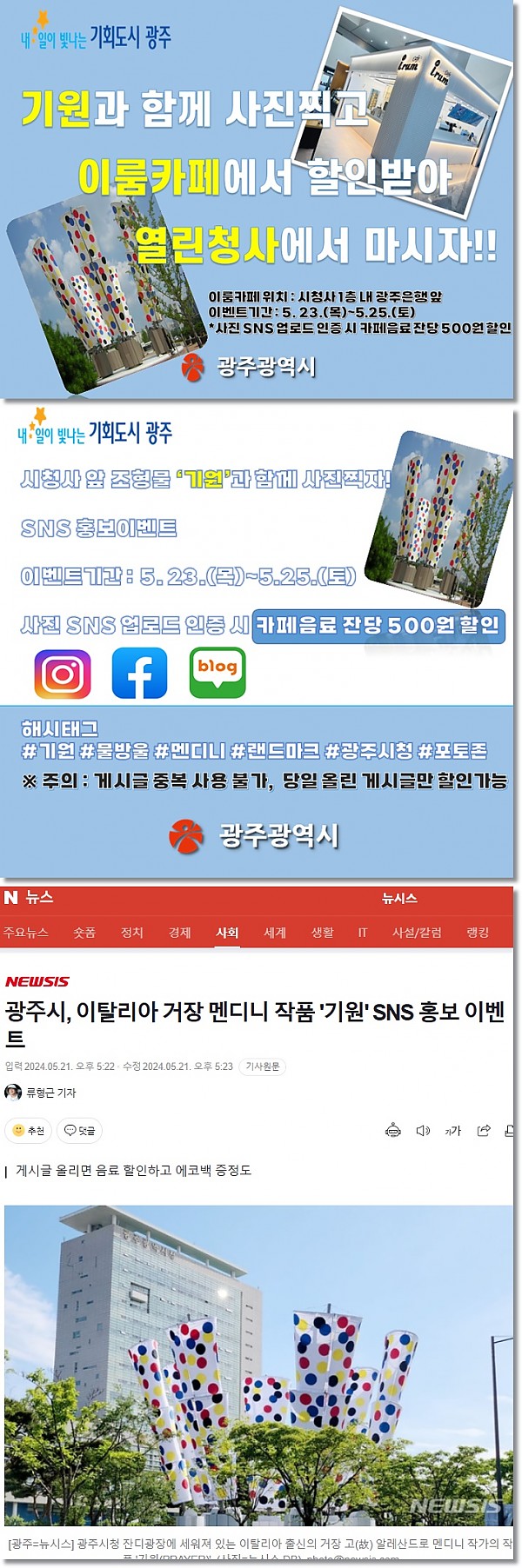 이룸카페 시청점 광주시민의날 할인 행사 페이지 정보 작성자 관리자 작성일24-06-10 15:14 조회2,983회 댓글0건 이전글 다음글 목록 본문 광주광역시 시민의날 행사 일환으로 시청사 앞 조형물 "기원"과 함께 사진찍고 SNS 인증 시 음료 할인행사를 진행했습니다. 이전글 다음글 목록