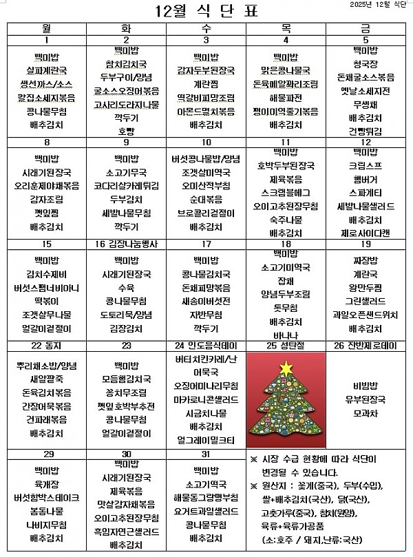 2025년 12월 식단표 ^^ 페이지 정보 작성자 관리자 작성일25-11-27 21:11 조회438회 댓글0건 이전글 다음글 목록 본문 12월에도 맛있게 먹고 건강한 마음으로 열심히 일해보겠습니다. ^^ 이전글 다음글 목록
