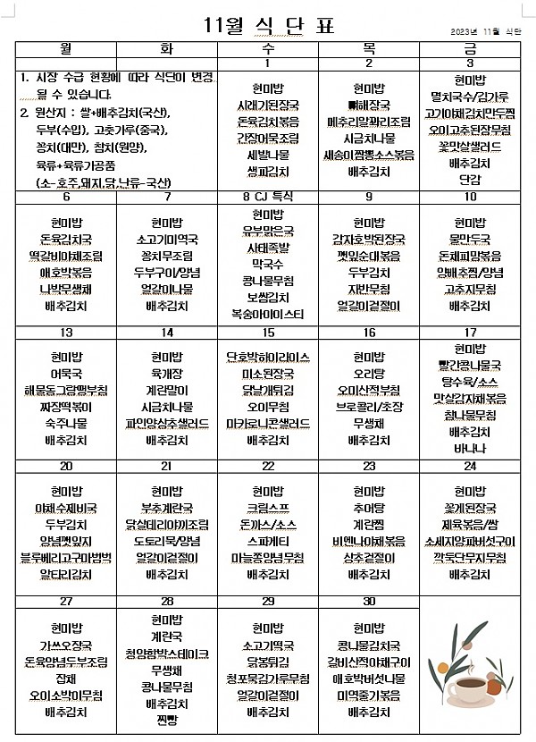 11월 식단표입니다.