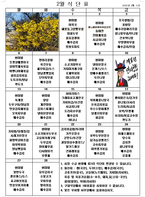 2023년 2월 식단표 ^^ 페이지 정보 작성자 관리자 작성일23-01-31 09:18 조회3,823회 댓글0건 이전글 다음글 목록 본문 2월에도 더욱 맛있는 음식을 준비하겠습니다. ^^ 이전글 다음글 목록