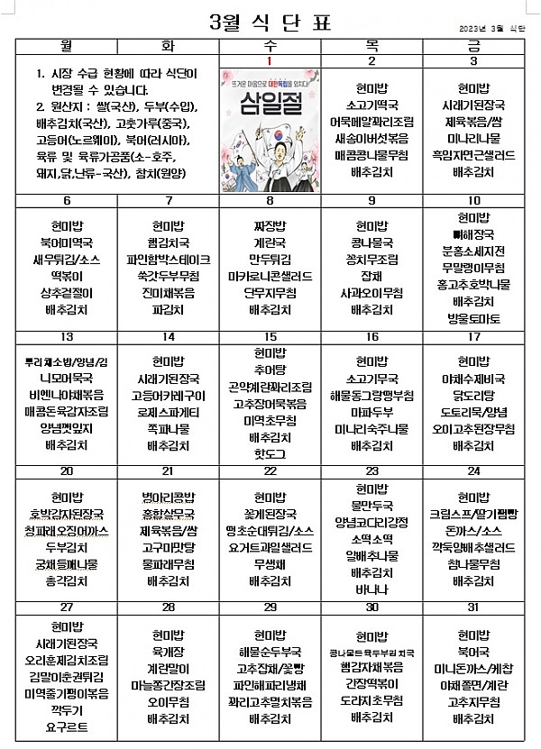 2023년 3월 식단표 ^^ 페이지 정보 작성자 관리자 작성일23-02-28 15:14 조회3,817회 댓글0건 이전글 다음글 목록 본문 3월에도 맛있게 먹고 열심히 달려보아요! ^^ 이전글 다음글 목록