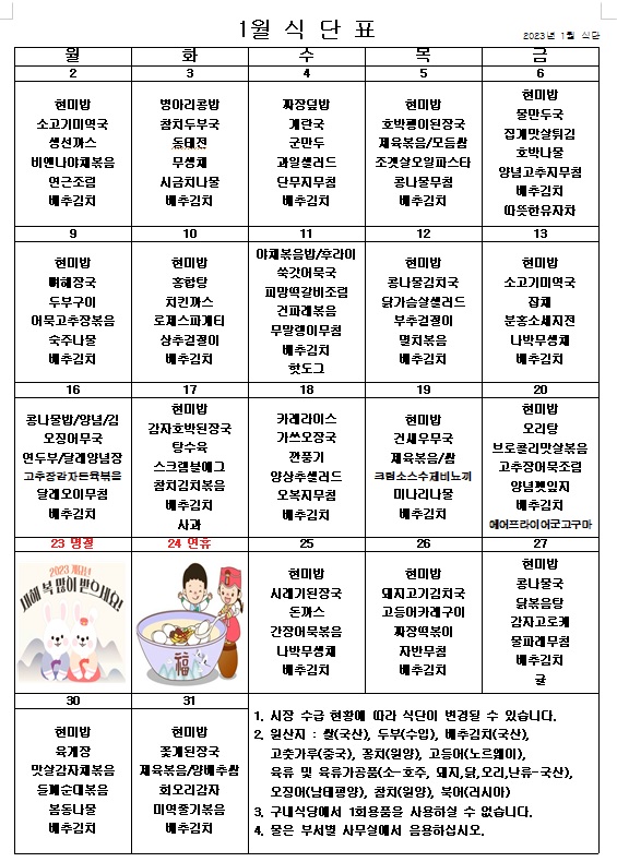 2023년 1월 식단표 ^^ 페이지 정보 작성자 관리자 작성일22-12-30 11:06 조회3,657회 댓글0건 이전글 다음글 목록 본문 내년에도 힘차게 달려봅시다! 이전글 다음글 목록