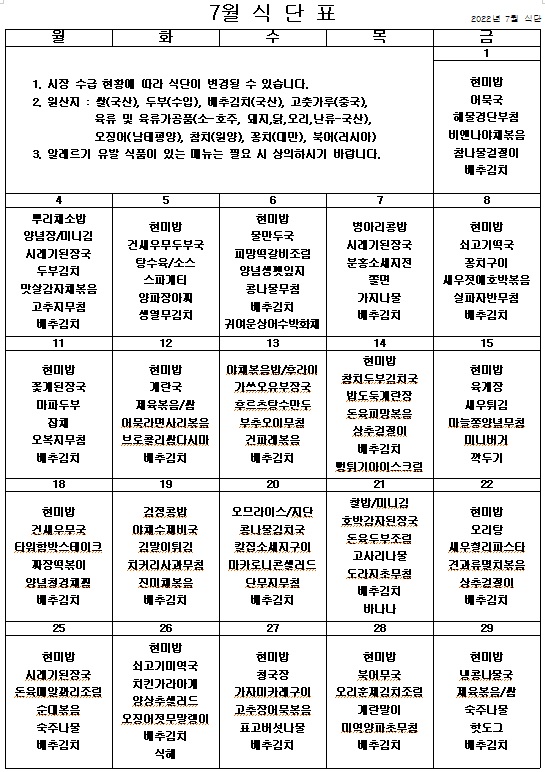 2022년 7월 식단표 ^^ 페이지 정보 작성자 관리자 작성일22-07-14 09:28 조회3,801회 댓글0건 이전글 다음글 목록 본문 무더운 여름이지만 식중독 발생에 주의하면서 맛있고 안전한 식단을 제공하도록 노력하겠습니다. 이전글 다음글 목록