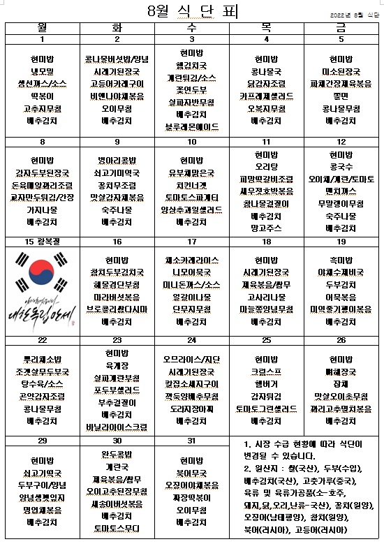 2022년 8월 식단표 ^^ 페이지 정보 작성자 관리자 작성일22-08-01 09:35 조회3,783회 댓글0건 이전글 다음글 목록 본문 무더운 여름이지만 식중독에 주의하면서 깨끗하고 맛있는 음식을 제공해드리도록 하겠습니다! ^^ 이전글 다음글 목록