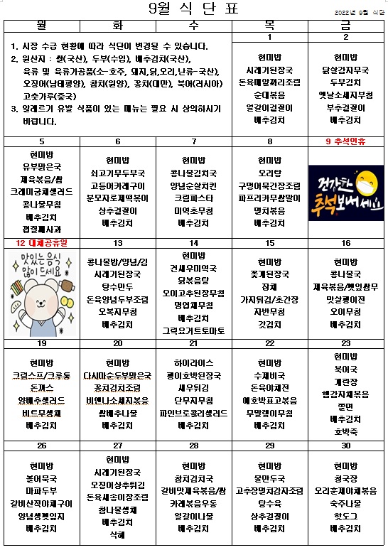 2022년 9월 식단표 ^^ 페이지 정보 작성자 관리자 작성일22-08-30 18:35 조회3,791회 댓글0건 이전글 다음글 목록 본문 보름달처럼 둥근 마음으로 풍성한 식단을 준비했습니다. 맛있게 먹고 모두의 건강을 지킬 수 있도록 열심히 노력하겠습니다. ^^ 이전글 다음글 목록
