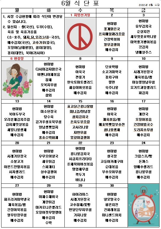2022년 6월 식단표 ^^ 페이지 정보 작성자 관리자 작성일22-05-31 15:04 조회3,851회 댓글0건 이전글 다음글 목록 본문 더욱 알차고 맛있는 식단을 제공하도록 노력하겠습니다. ^^ 이전글 다음글 목록