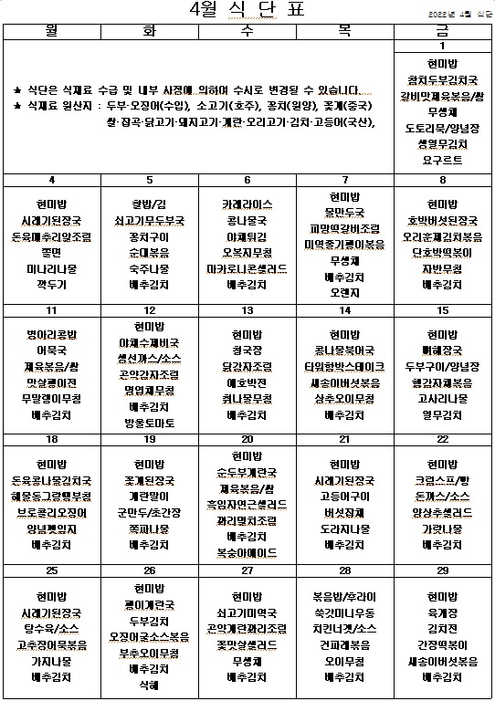2022년 4월 식단표 ^^ 페이지 정보 작성자 관리자 작성일22-03-30 19:12 조회4,066회 댓글0건 이전글 다음글 목록 본문 코로나가 아무리 심해져도 우리의 열정을 막을순 없죠. 맛있고 건강한 식단으로 힘을 내서 슬기롭게 코로나를 이겨내보아요. ^^ 이전글 다음글 목록