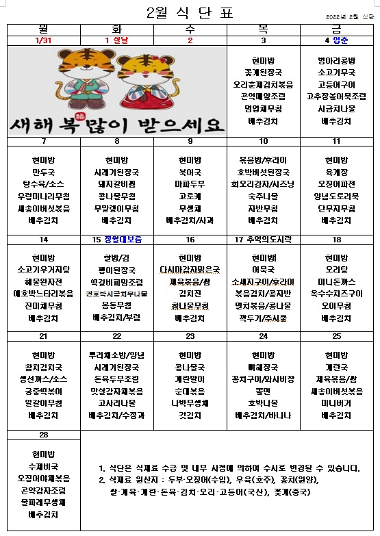 2022년 2월 식단표 ^^ 페이지 정보 작성자 관리자 작성일22-01-27 15:59 조회4,133회 댓글0건 이전글 다음글 목록 본문 맛있게 먹고 힘을 내서 코로나를 이겨내봐요! ^^ 이전글 다음글 목록
