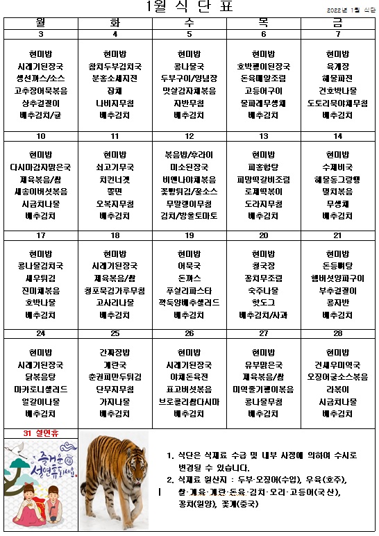 2022년 1월 식단표 ^^ 페이지 정보 작성자 관리자 작성일21-12-31 09:51 조회4,021회 댓글0건 이전글 다음글 목록 본문 계속되는 코로나로 힘들고 지치지만 안전하고 맛있게 먹으면서 지금 시기를 잘 이겨내보아요! ^^ 이전글 다음글 목록