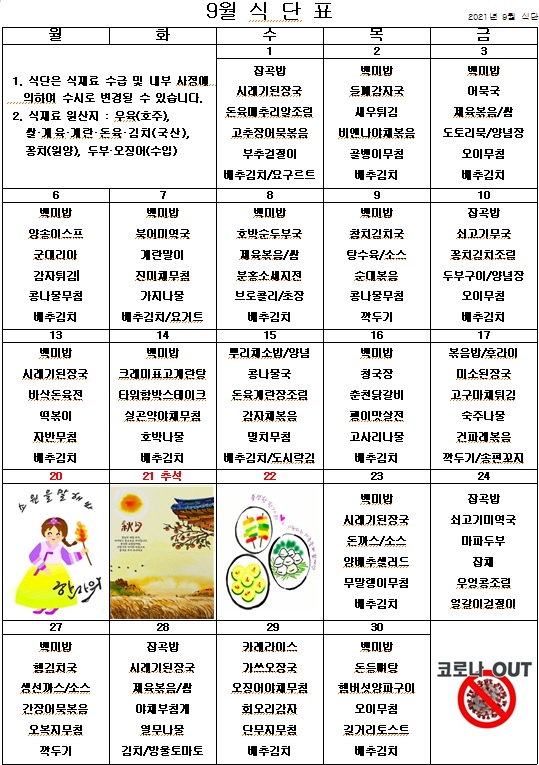 2021년 9월 식단표 ^^ 페이지 정보 작성자 관리자 작성일21-09-01 17:25 조회4,238회 댓글0건 이전글 다음글 목록 본문 맛있게 먹고 힘내서 화이팅! ^^ 이전글 다음글 목록