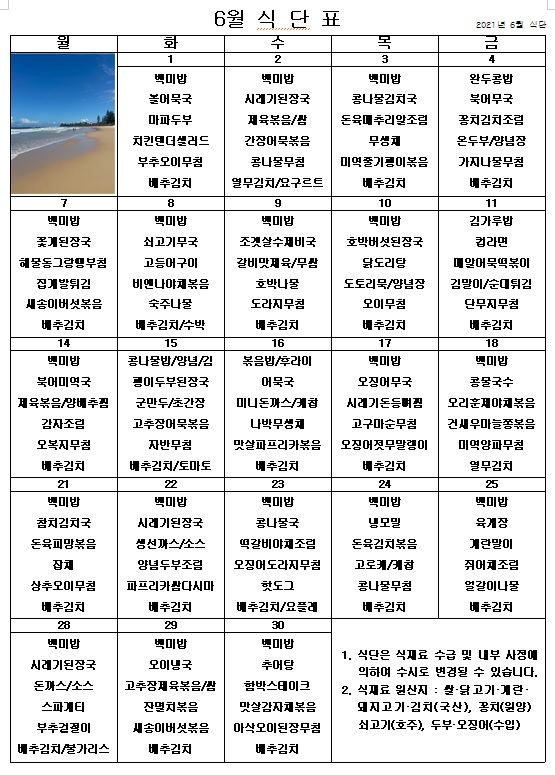 2021년 6월 식단표 페이지 정보 작성자 관리자 작성일21-06-01 14:49 조회4,371회 댓글0건 이전글 다음글 목록 본문 맛있는 점심을 먹고 힘을 내서 지금 이 시국을 잘 이겨내보아요! ^^ 이전글 다음글 목록