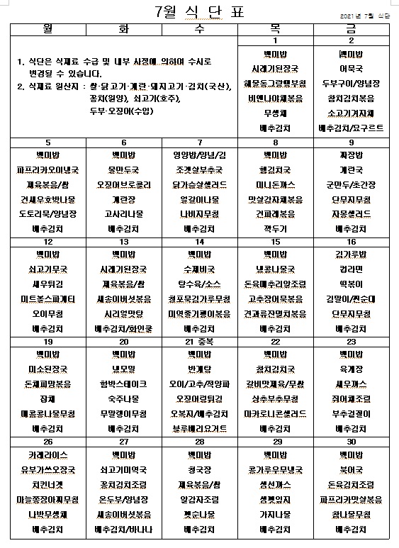 2021년 7월 식단표 페이지 정보 작성자 관리자 작성일21-06-30 15:25 조회4,212회 댓글0건 이전글 다음글 목록 본문 더워지는 여름 맛있게 먹고 모두 힘냅시다! ^^ 이전글 다음글 목록