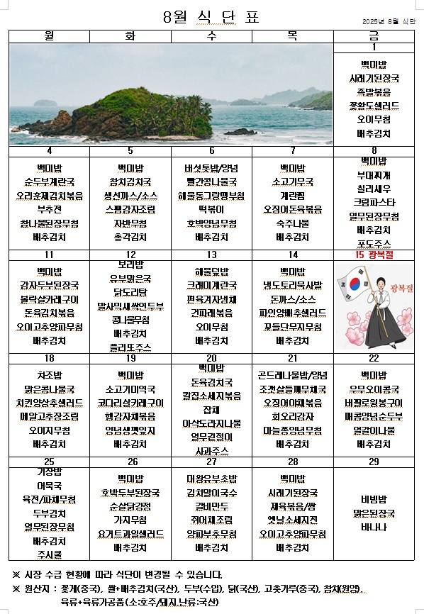 2025년 8월 식단표 ^^ 페이지 정보 작성자 관리자 작성일25-07-31 10:58 조회794회 댓글0건 이전글 다음글 목록 본문 더워도 너무 더운 여름이지만 건강한 음식을 맛있게 먹고 힘내서 8월에도 열심히 일하겠습니다! ^^ 이전글 다음글 목록