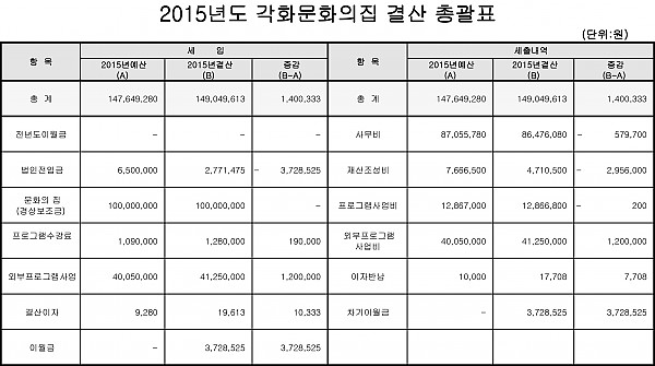 2015년 각화문화의집 결산 공고 페이지 정보 작성자 배지연 작성일16-02-17 15:50 조회9,612회 댓글0건 이전글 다음글 목록 본문 2015년 각화문화의집 결산을 공고 합니다. 이전글 다음글 목록