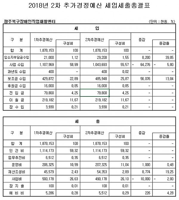 2018 광주북구장애인직업재활센터 2차 추가경정 세입세출(예산) 공고