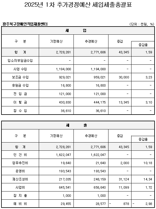 2. 공고사항 : 2025년 광주북구장애인직업재활센터 1차 추가경정 세입·세출 예산서