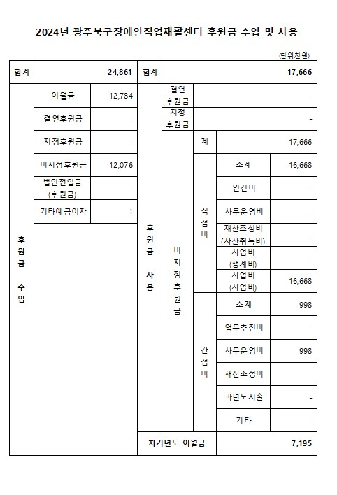 2024년 광주북구장애인직업재활센터 후원금 수입 및 사용내역 공고 페이지 정보 작성자 관리자 작성일25-03-11 16:06 조회7,802회 댓글0건 이전글 다음글 목록 본문 사회복지법인 및 사회복지시설 재무․회계규칙 제41조의 6의 규정에 의거하여 2024년 광주북구장애인직업재활센터 후원금 수입 및 사용 내역을 다음과 같이 공개합니다. 이전글 다음글 목록