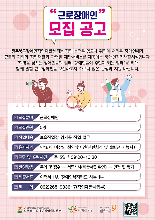 근로장애인 모집 공고 페이지 정보 작성자 관리자 작성일24-05-03 15:33 조회12,586회 댓글0건 이전글 다음글 목록 본문 *미싱 작업 가능자 우대* 광주북구장애인직업재활센터에서 함께 일할 근로장애인을 모집합니다. 많은 관심과 참여 부탁드립니다. 이전글 다음글 목록