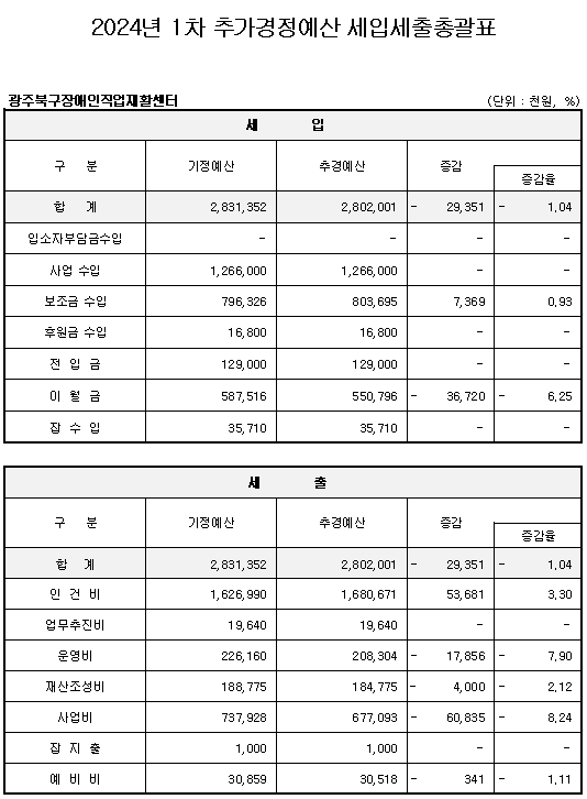 2. 공고사항 : 2024년 광주북구장애인직업재활센터 1차 추가경정 세입·세출 예산서