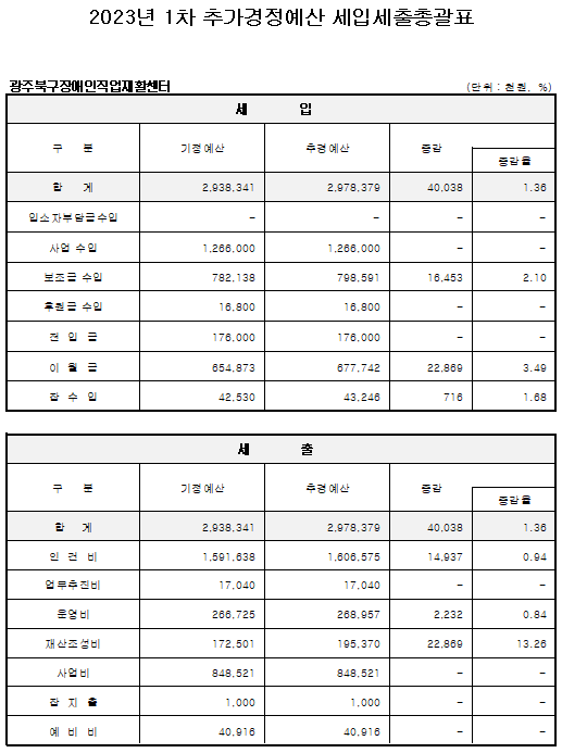 2. 공고사항 : 2023년 광주북구장애인직업재활센터 1차 추가경정 세입·세출 예산서