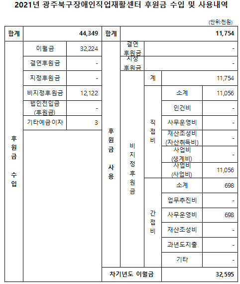 2021 광주북구장애인직업재활센터 후원금 수입 및 사용내역 페이지 정보 작성자 관리자 작성일22-03-24 10:30 조회15,875회 댓글0건 이전글 다음글 목록 본문 사회복지법인 및 사회복지시설 재무․회계규칙 제41조의 6의 규정에 의거하여 2021 광주북구장애인직업재활센터 후원금 수입 및 사용 내역을 다음과 같이 공개합니다. 이전글 다음글 목록