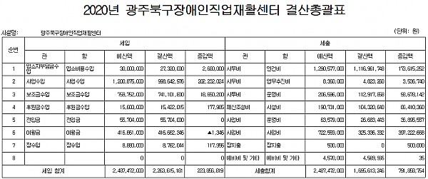 사회복지법인 및 사회복지시설 재무․회계규칙 제 19조 및 제 20조 규정에 의거하여 2020 광주북구장애인직업재활센터 세입 및 세출 결산을 다음과 같이 공개합니다.