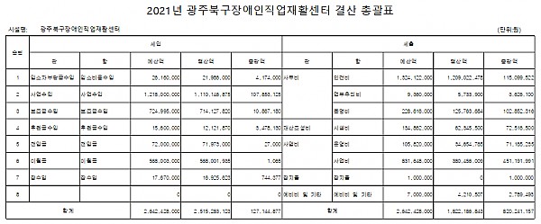 사회복지법인 및 사회복지시설 재무․회계규칙 제 19조 및 제 20조 규정에 의거하여 2021 광주북구장애인직업재활센터 세입 및 세출 결산을 다음과 같이 공개합니다.